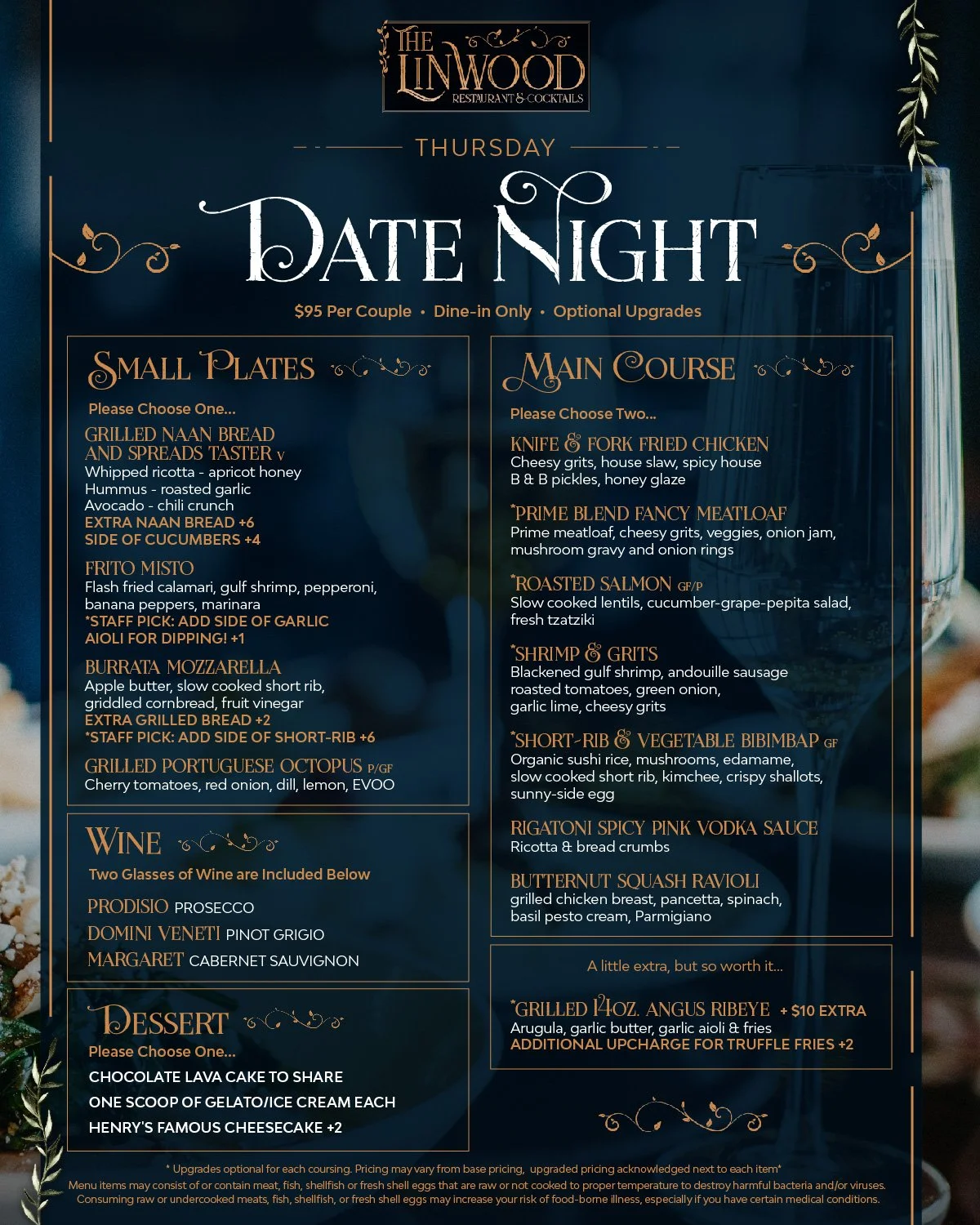 Enjoy our Date Night Special! Shared appetizer, 2 entrees, Live music, 2 glasses of wine or prosecco, and a shared dessert! Dine in and enjoy this deal for only $95 per couple!